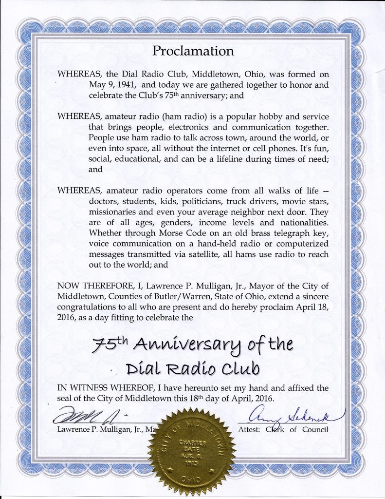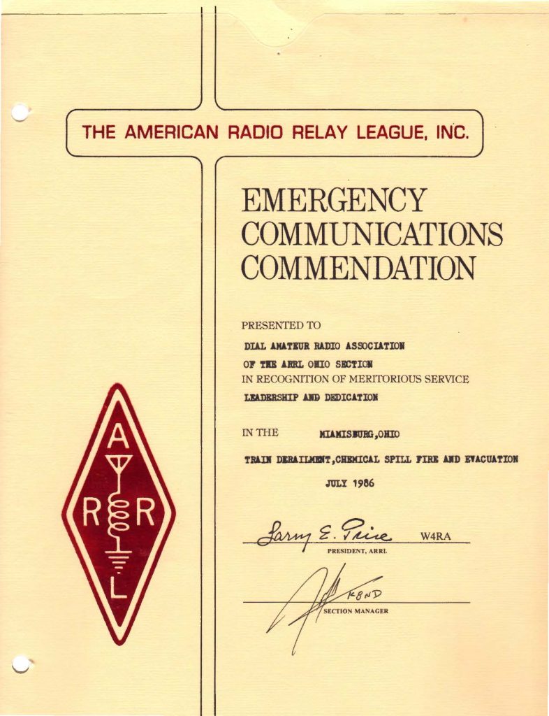 On Tuesday July 8, 1986, a train derailed on the west side tracks of Miamisburg, Ohio. Among one of the derailed cars was a tanker car containing 12,000 gallons of toxic, white phosphorus. The tanker car was dragged close to a full mile, coming to rest south of the Bear Creek bridge and in the process was punctured. As the white phosphorus vapor and oxygen in the air met, it ignited spontaneously, which sent white phosphorus clouds rising up to 15,000 feet into the air over the city. A second and larger flare-up on Wednesday evening of the tanker car caused the Miamisburg Police Department to request much more help. Saturday, July 12th, the fire finally subsided. Many amateur radio operators including Dial members assisted with communications. Dial received a recongnition of meritorious service from the president of the ARRL, Larry W4RA.