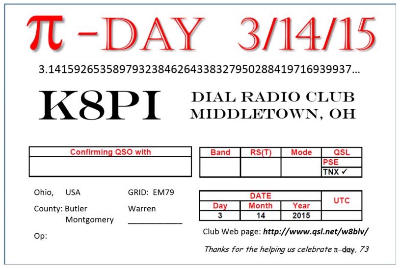 Dial’s contest call is K8PI, so it was only natural to operate K8PI as a group activity on International Pi-Day (03/14/15).  W8EH offered his home as a site and quite a few Club members came by to participate.  We made a special QSL card that was requested by about 150 of the people that we contacted.