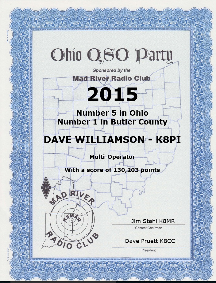 Dial competed in the 2015 Ohio QSO Party.  We operated two stations with one station full time SSB voice and the other was SSB voice/CW operation.  We placed 5th in Ohio and 1st in Butler County.