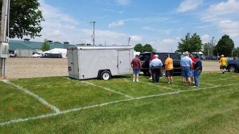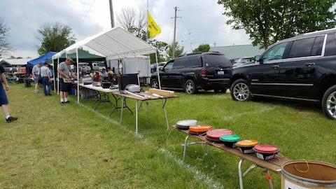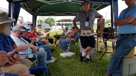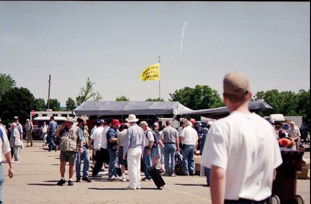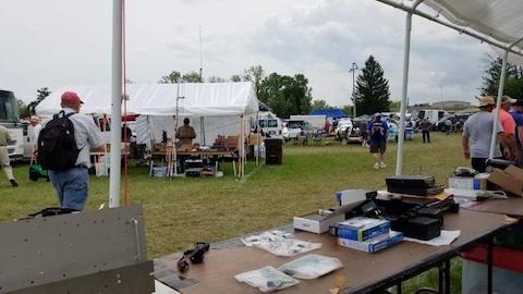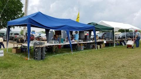 We also continued the tradition where we are easily distinguished by the yellow Dial flag on the mast that supports our portable repeater. We have a trailer for temporary storage of purchases, display tables for members to sell radio related items, and a canopy for shelter. We also provide water, soft drinks, snacks to members, and some chairs for relaxation.