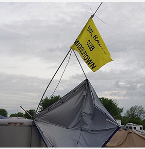 We are easily distinguished by the yellow Dial flag on the mast that supports our portable repeater. We have a trailer for temporary storage of purchases, display tables for members to sell radio related items, and a canopy for shelter. We also provide water, soft drinks, snacks to members, and some chairs for relaxation.