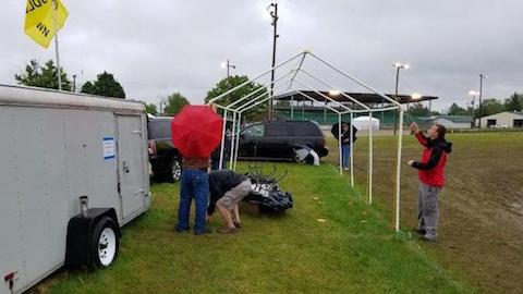 In spite of some pretty severe weather during setup on Friday (trees were downed, roads were blocked and power was off to areas surrounding our Field Day site at Smith Park, Middletown, OH), we were able to set up our stations and operate for the full period.