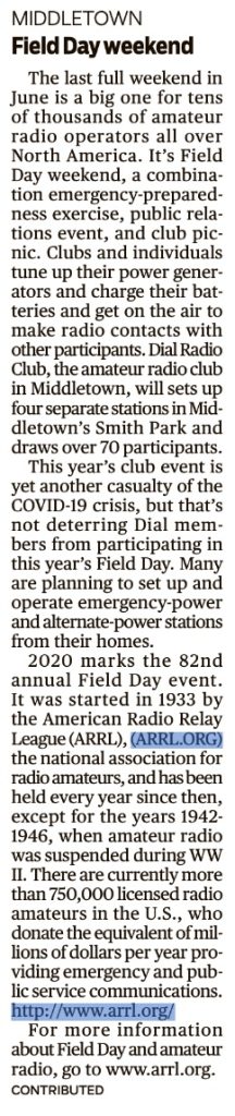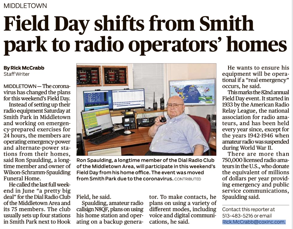 Dial Radio Club participated in the ARRL Field Day at our homes instead of Smith Park because of the COVID Pandemic. Utilizing the ARRL special rules, we used our own individual call signs, submitted our contacts as independent scores, indicating our club name so our scores were added together for our club total.